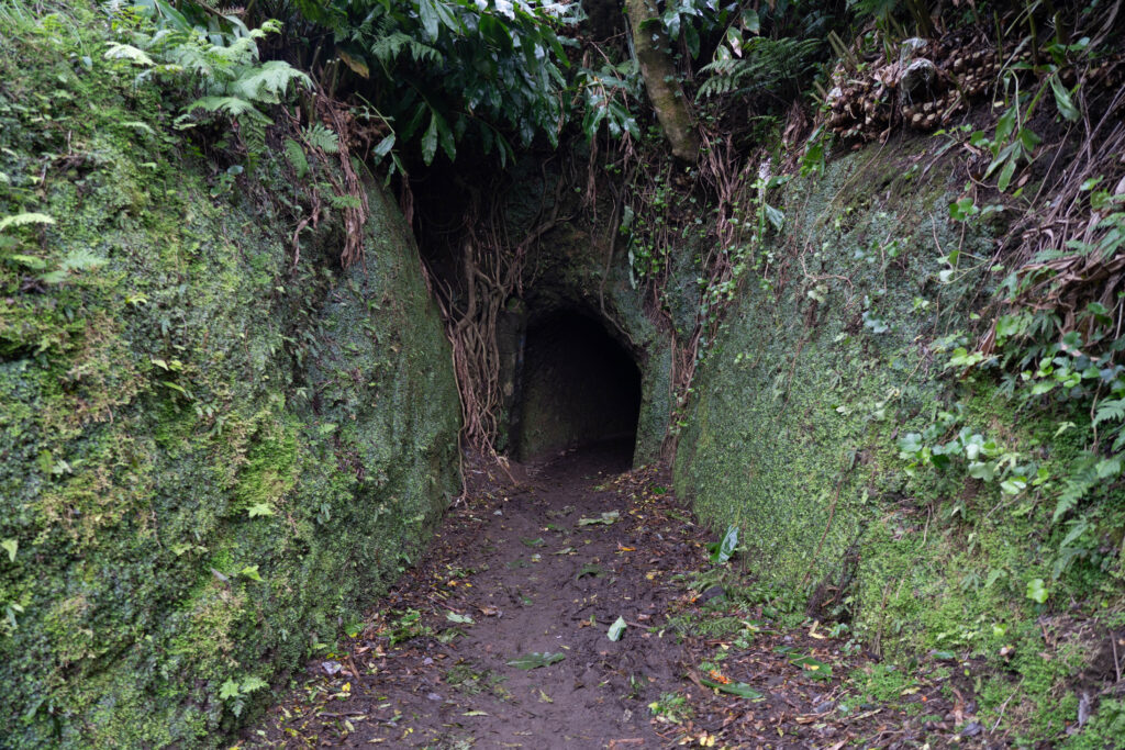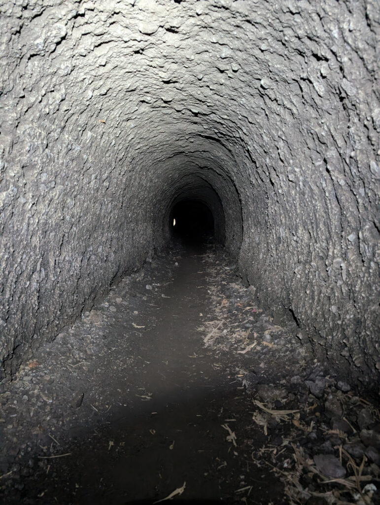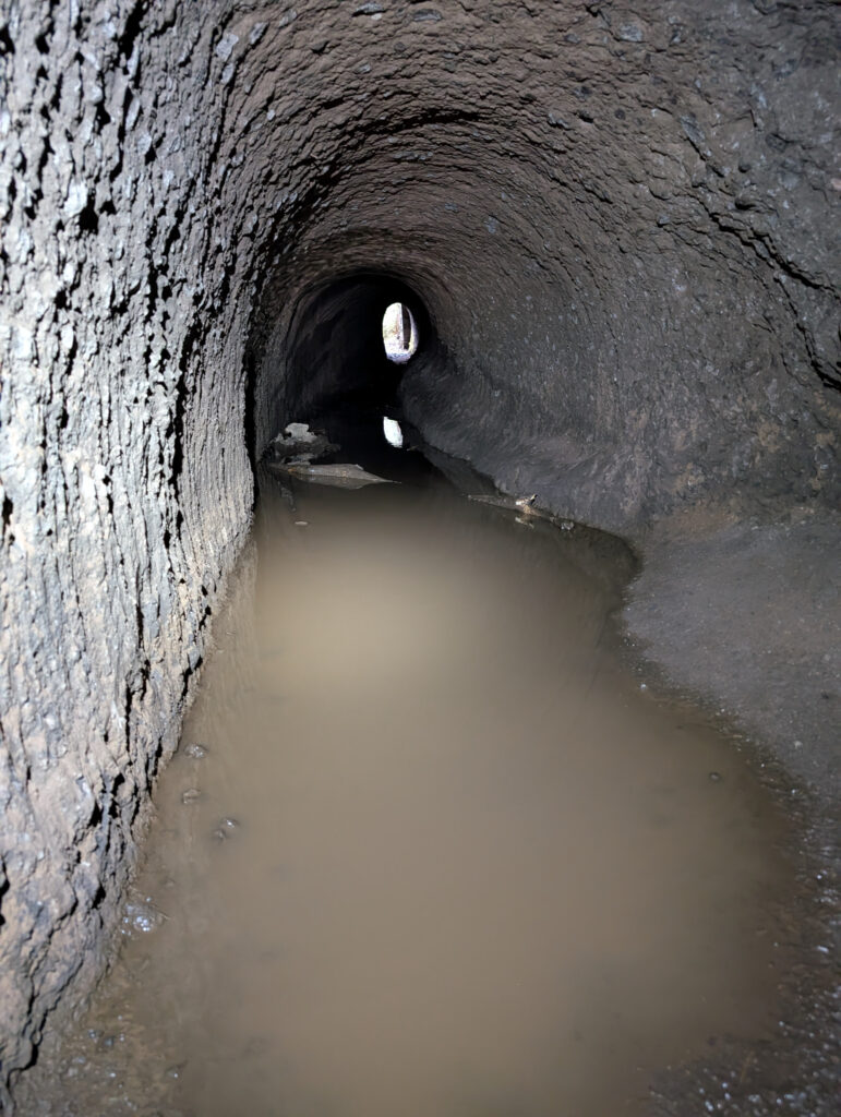 Ich muss mich bücken, um einzutreten. Der Tunnel ist nicht höher als 1,40 Meter. In der Ferne kann ich hinter einer Biegung den Ausgang erahnen. Geduckt und im Schein meiner Taschenlampe gehe ich langsam vorwärts.