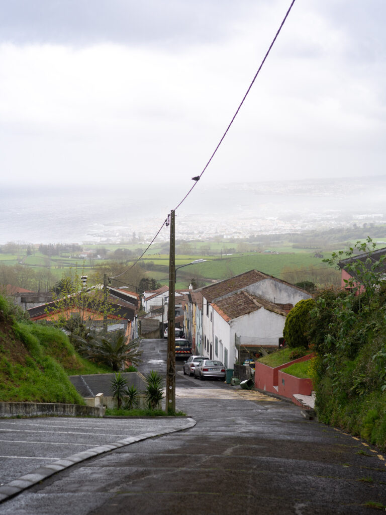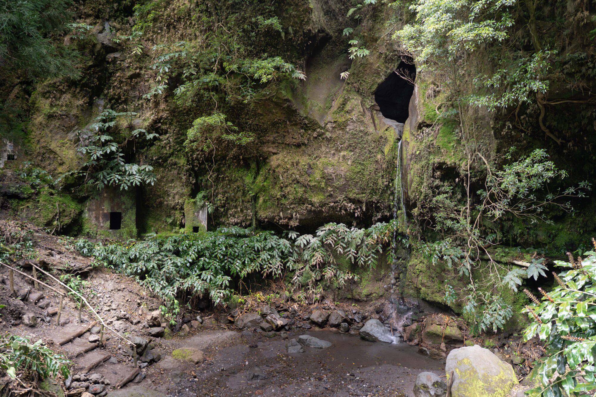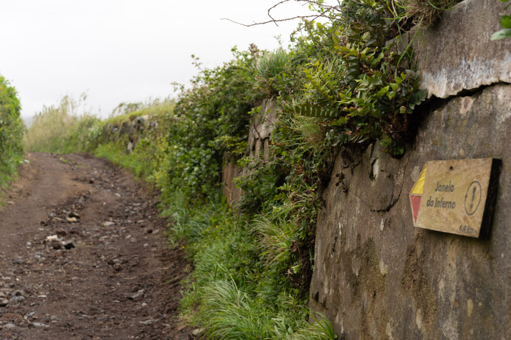 In meiner Unterkunft liegt eine Mappe mit ein paar Empfehlungen für Wanderungen in der Nähe. Also mache ich heute keine Experimente mit Komoot und begebe mich direkt an den Startpunkt einer offiziellen Wanderung zum Janela do Inferno. Ich hab auch nicht wirklich Bock, mich heute mit einer App zu verlaufen. Der Himmel ist grau, es nieselt und der Wind bläst mit 30 Knoten. Es fröstelt mich etwas und es dauert eine Weile, bis mir durch das Laufen warm wird. Der Weg lässt sich aber gut laufen und die Route ist perfekt beschildert.