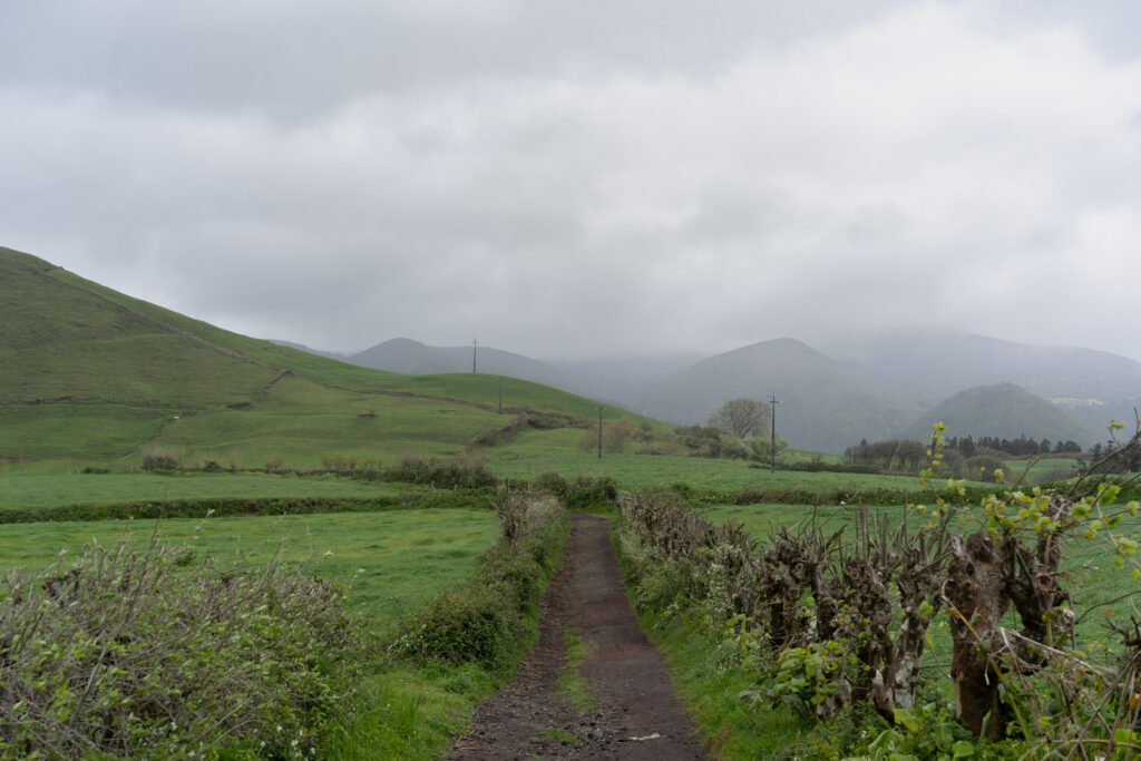 Der Weg führt mich entlang an grünen Feldern, auf denen Kühe grasen. Es geht bergauf. Vor mir verschwindet die Landschaft in dichten Regenwolken. Oder ist das der Qualm, der aus der Hölle emporsteigt? Dann wird’s wenigstens bald warm.
