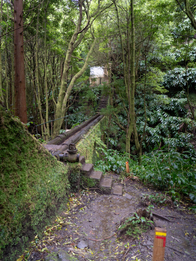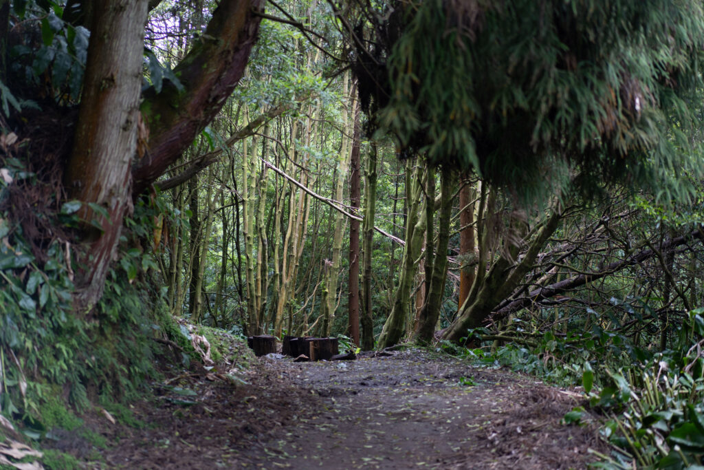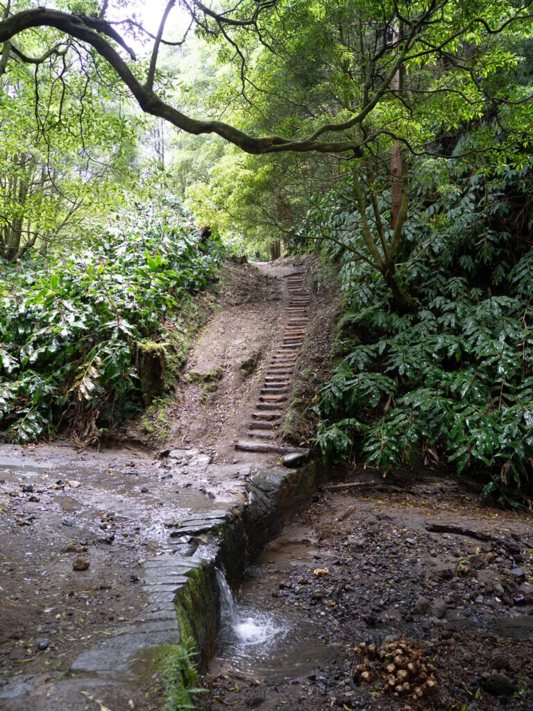 Der Regen hat durch das dichte Blätterdach kaum ein Durchkommen. Es tröpfelt hier nur noch ein wenig aus den Bäumen. Auch von den 30 Knoten Wind merke ich nichts mehr. Es wird angenehm warm. Ich laufe weiter durch ein Tal auf matschigen Pfaden. Hin und wieder führen Steinstufen einen Hang hinauf. Ohne die wäre auf dem rutschigen Boden kein Fortkommen möglich.